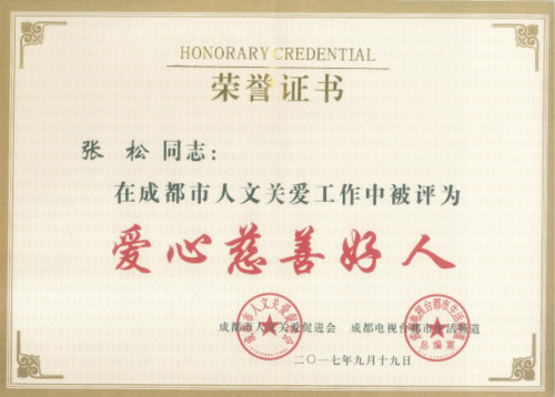 ★2017年公司董事局主席张松同志被成都市人文关爱促进会特授予“爱心慈善好人”
