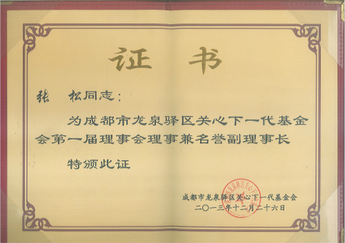 ★2013年12月26日公司董事局主席张松同志被聘为成都市龙泉驿区关心下一代基金的会理事会理事兼名誉副理事长